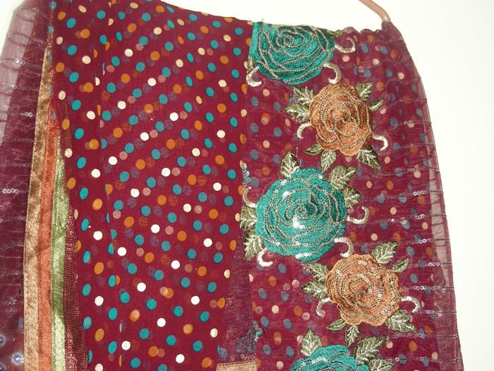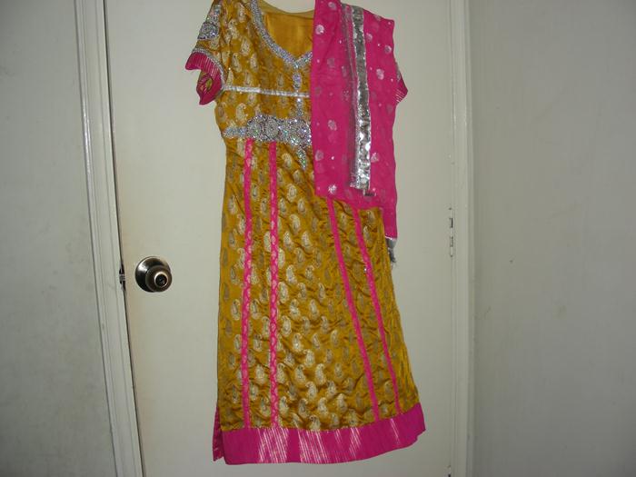 New stiched mehndi dress with pink chifffon dupatta.