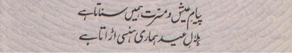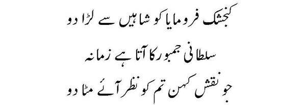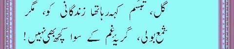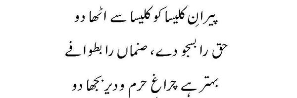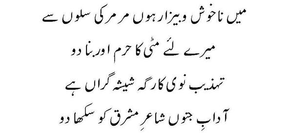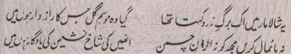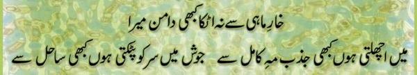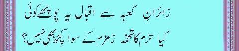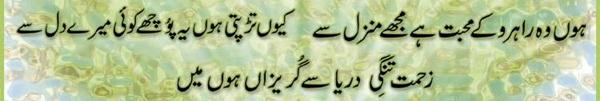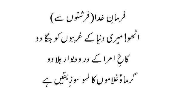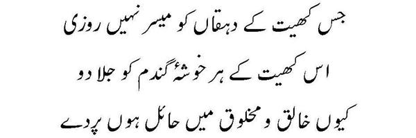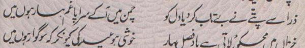 Ya Rabb Dil-e-Muslim Ko, Wo Zinda Tamanna De; Jo Qalb Ko Garma De, Jo Rooh Ko Tarpa De! Phir Wadi-e-Faaraan Ke Har Zarre Ko Chamka De Phir Shouk-e-Tamaasha De; Phir Zoq-e-Taqaaza De Mehroom-e-Tamaasha Ko, Phir Deeda-e-Beena De Dekha Hai Jo Kuch Maine Auron Ko Bhi Dikhla De! Bhatke Huwe Aahoo Ko, Phir Soo-e-Haram Le Chal; Uss Shehar Ke Khoogar Ko Phir Us'at-e-Sehra De!! Paida Dil-e-Viraan Mein, Phir Shorish-e-Mehshar Kar; Iss Mehmil-e-Khaali Ko, Phir Shahid-e-Laila De!! Is Daur Ki Zulmat Mein, Har Qalb-e-Parishaan Ko; Wo Daag-e-Mohabbat De, Jo Chaand Ko Sharma De!! Raf'ath mein maqaasid ko, Hamdosh-e-Surayya Kar; Khuddari-e-Saahil De, Aazaadi-e- Dariya De!! Be Lous-e-Mohabbath Ho, Be Baak-e-Sadaaqat Ho; Seenon Mein Ujaala Kar, Dil Soorat-e-Meena De!! Ehsaas Inaayat Kar, Aasar-e-Museebat Ka; Imroz Ki Shorish Mein, Andesha-e-Farda De!! Main Bulbul-e-Naalan Hoon, Ek Ujde Glistaan Ka Taaseer Ka Saa'il Hoon, Mohtaaj Ko Daata De!!