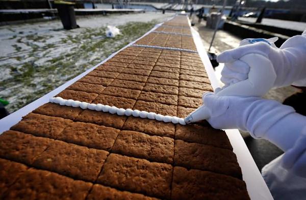 Subject : longest gingerbread Bakers link pieces of gingerbread in order to break a world record on December 18, 2009 in Ludwigsburg, southern Germany. A total of 1,700 kg of honey, 1,700 kg of flour, 1,000 kg of walnuts, 900 kg of hazelnuts, 550 liters of milk and 158 liters of cherry schnapps were used to make the one kilometer-long and seven-ton-heavy gingerbread.