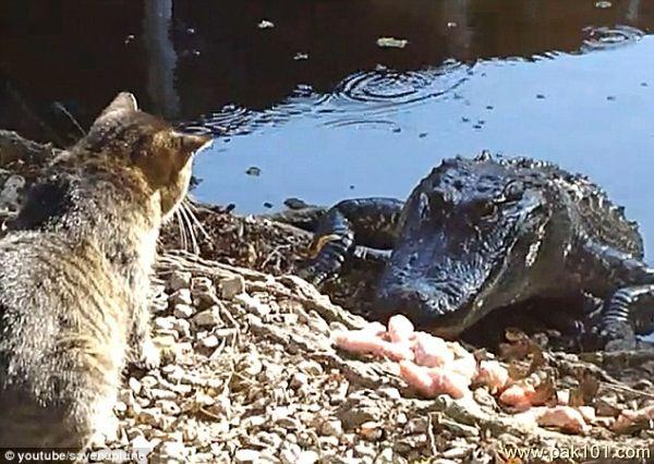 View the epic battle between the chat and the alligator. Find out for yourself what happens next.