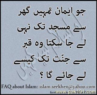 hmmmm bilkul sahi....nice sharing.... aaj kl bahut km log he jo namaz ki taraf aate he or bahut se log ese hain jinhe namaz ki taraf bulayen to kehte he mera dil nhi kr raha ya fir kabhi parh lunga ya keh dete he ham ne apne amal ke sath qabar me jana e tumne apny amal ke sath.....mera khyaal he ke esa nhi hona chahiye balke hame koi deen ki taraf bulata he to us taraf khushi khushi chly jana chahiye is se dono ko sawal hasil hoga...