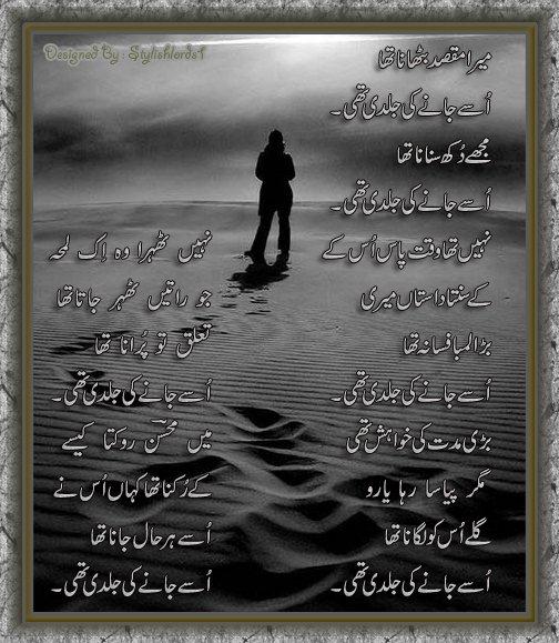 Jab dost juda ho jaty hain..,Jab log khafa ho jaty hain.., Jab chand kahein kho jata hai.., Jab chehry madham party hain.., Jab raat ki bikhri zolfoun py koe badal sa cha jata hai.., Jab meri bheegi palkon per Koe ansoo deep jalata hai., tab mery soonay angan main, Tum deep jalany aaty ho,,. Tum yaad bohat hi aaty ho TUM YAAD BOHAT HI AATY Ho..