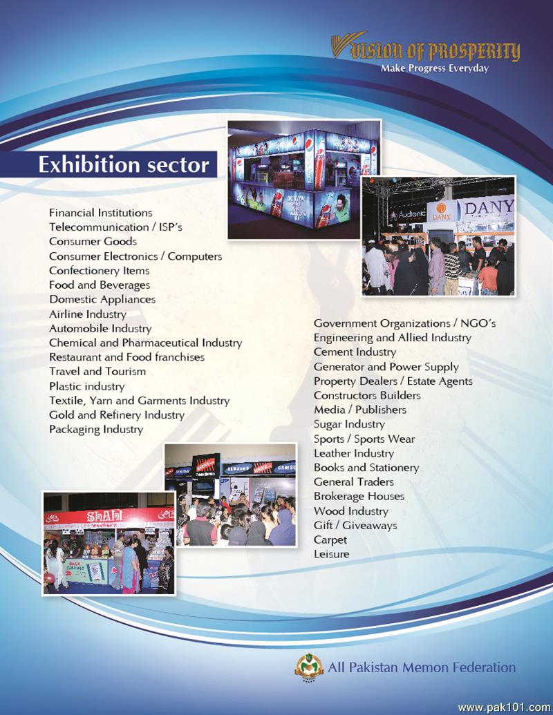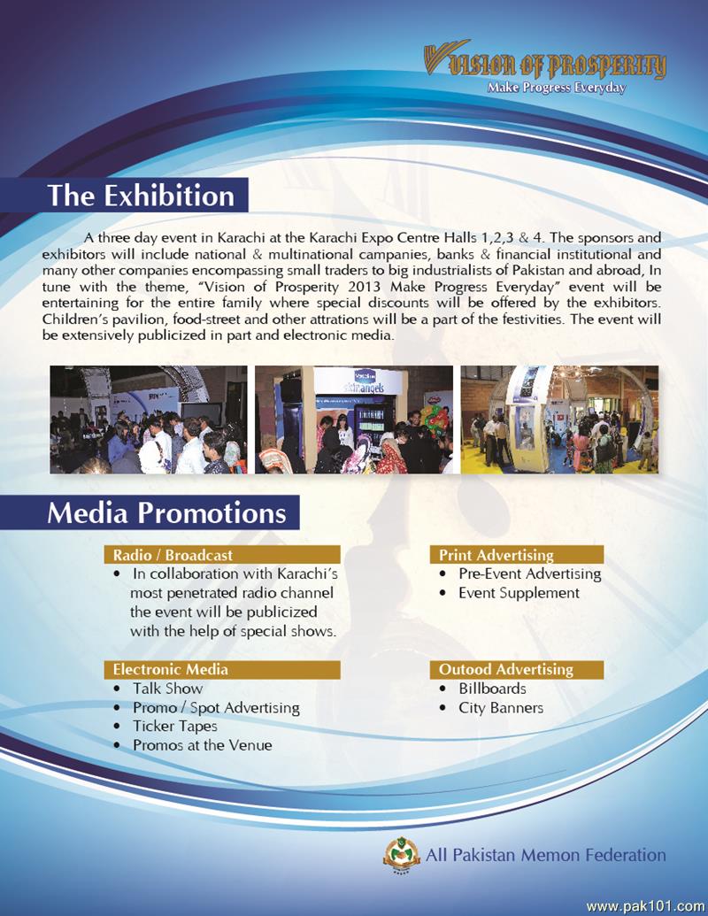 Subject : Exhibition Event <3''''''-EXHIBITION - EXHIBITION - EXHIBITION-''''''<3 “Vision of Prosperity 2013- Make Progress Everyday”All Pakistan Memon Federation is organizing its sixth bi-annual event “Vision of Prosperity” Exhibition from INSHA-ALLAH 05-06-07 April 2013 at Karachi Expo Center. The exhibition theme is “Vision of Prosperity 2013- Make Progress Everyday” and is being managed by E-commerce Gateway Pakistan (Pvt.) Ltd. APMF has designed this event to act as the avenue for interactive business-to-business linkages and business-to-consumer relationship. STALL BOOKING For further assistance and information please contact: Mr .Mohammad Afzal Bhujwala Chairman Exhibition Committee Cell: 0344-8297555, 0334-5558297 For more Details : apmfexhibition2013.blogspot.com http://karachi.olx.com.pk/vision-of-prosperity-exhibition-2013-iid-483567383 http://classifieds.hamariweb.com/vision-of-prosperity-exhibition2013-44165-details/ www.facebook.com/vop2013 PDF Brochure Link : https://docs.google.com/file/d/0B1AOSF5NOj1DOFYwVXJ3Z0wyeGs/edit?usp=sharing&pli=1 com.jpg)