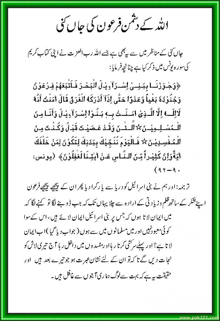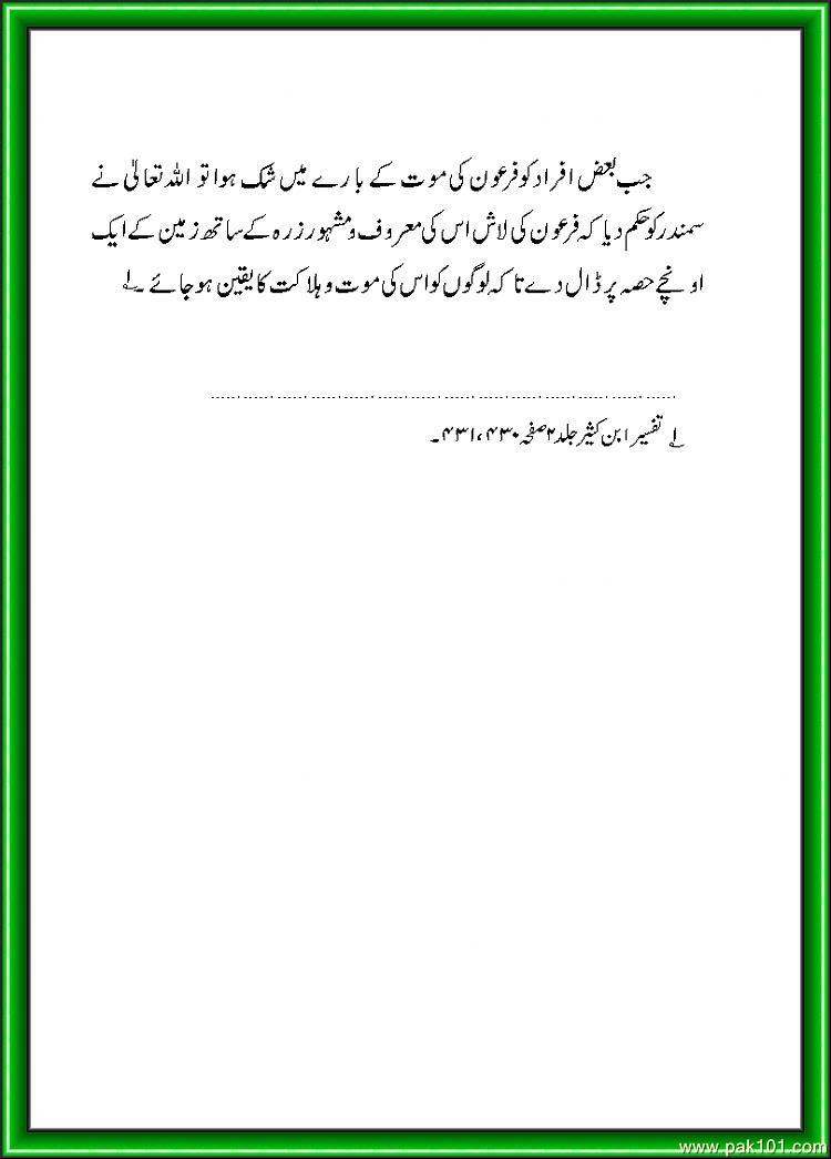 firaun ki dead body aaj bhee misar (egypt) kay aik museum may dekhi ja sakti hai.. ye un logon kay liye nishane ibrat hai jo samajhtay hain kay islam ko nuqsan pohchana bohat aasaan hai ..
