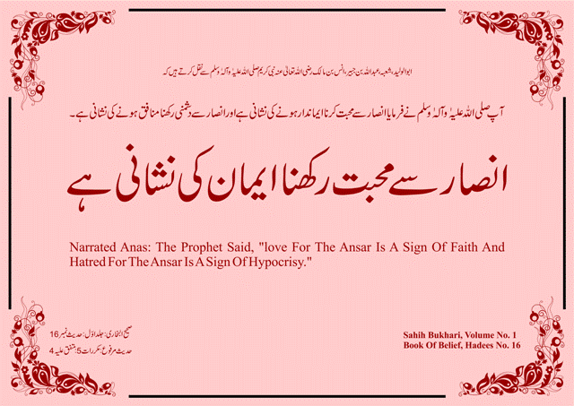 com.gif) Roman Urdu : Aap Sallal Laho Alaihi Wa Aalihi Wa Sallam Nay Farmaya Ansaar Say Muhabbat Emaan Daar Honay Ki Nishani Hai Aur Ansaar Say Dushmani Rakhna Munafiq Honay Ki Nishani Hai. Sahih Al-Bukhari : Jild No. 1: Hadees : 16 Hadees Marfooh : Mukarrarat 5 : Muttafiq Alaih : 4 English Translation : Narrated Anas: The Prophet Said, "love For The Ansar Is A Sign Of Faith And Hatred For The Ansar Is A Sign Of Hypocrisy."