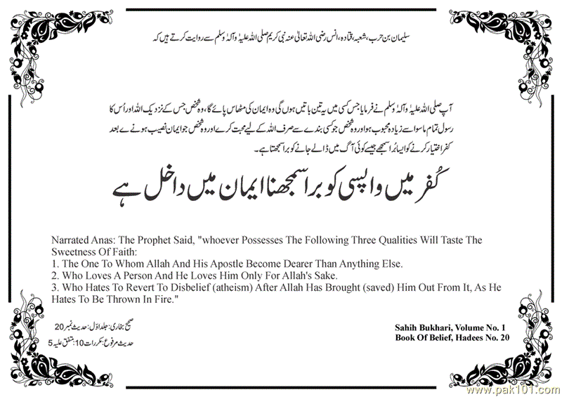 com.gif) Kufar May Wapisi Ko Bura Samajhna Emaan May Dakhil Hai Roman Urdu : Aap Sallal Laho Alaihi Wa Aalihi Wa Sallam Nay Farmaya Jis Kisi May Ye 3 Batain Hon Gee Wo Emaan Ki Mithas Paye Ga : Wo Shakhs Jis Kay Nazdeek Allah Aur Uska Rasool Tamam Ma Siwa Say Zeyada Mehboob Ho. Wo Shakhs Jo Kisi Banday Say Sirf Allah Kay Liye Muhabbat Karay. Wo Shakhs Jo Emaan Naseeb Honay Kay Baad Kufar Ikhteyar Karnay Ko Aisa Bura Samjhay Jaisay Koi Aag May Dalay Janay Ko Bura Samajhta Hai. Sahih Bukhari : Jild No.1 : Hadees No. 20 Hadees Marfooh : Mukarrarat 10 : Muttafiq Alaih 5 English Translation : Narrated Anas: The Prophet Said, "whoever Possesses The Following Three Qualities Will Taste The Sweetness Of Faith: The One To Whom Allah And His Apostle Become Dearer Than Anything Else. Who Loves A Person And He Loves Him Only For Allah's Sake. Who Hates To Revert To Disbelief (atheism) After Allah Has Brought (saved) Him Out From It, As He Hates To Be Thrown In Fire." For More Ahadees : Visit : Sahih Al-Bukhari Blog Join Us On Facebook