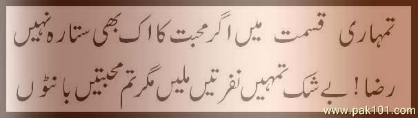 KHAMOOSHI KI ZUBAN IN AANKHON SE PARHO... DIL MUZTARIB HAI KUCH KAHOO TUM KAHO... TERI YAADON MAI HAR PAL DOOBAY HAIN SANAM.... YE MUSKHARAT AARZI HAI KHUD SE ROOTHAY HAIN SANAM... EK TERE SIVA KISI AUR KO DIL MAI BASAYA NAHI HAI... HUSN KI FOUJ HAI DILRUBAO KI LINE LAGEE HAI.... PER TUM HE TUM MERI BAATON MAI... TUM HE TUM MERI SANSO MAI... TUM HEE TUM MERI AANKHON MAI... NEENDON MAI , KHUWABOON MAI.... BUSS TUM HEE TUM..... HO SANAM.....!!!!!KHAMOOSHI KI ZUBAN IN AANKHON SE PARHO... DIL MUZTARIB HAI KUCH KAHOO TUM KAHO... TERA SEHR RUG O JAAN PE CHAHYA HAI SANAM... TERE BIN ZINDAGI JAISAY DHOOP MAI KHARAY HAIN SANAM... TERE SEHR MAI KUCH AUISAY JAKAR GAYEE HAI SANAM.... JANTI HAI WO MAGAR MAANTI NAHI HAI... MERI RAHAT , CHAHAT , WOHEE MERI ZINDAGI HAI... BATAO NA ZAARA KIA NARAZGEE HAI..... PER TUM HEE TUM MERI RAHOON MAI... TUM HEE TUM MERI WAADON MAI... TUM HE TUM MERI HAWALON MAI.... YAADON MAI , IRADON MAI.... BUSS TUM HEE TUM ... HO SANAM...!!!!! RAZA