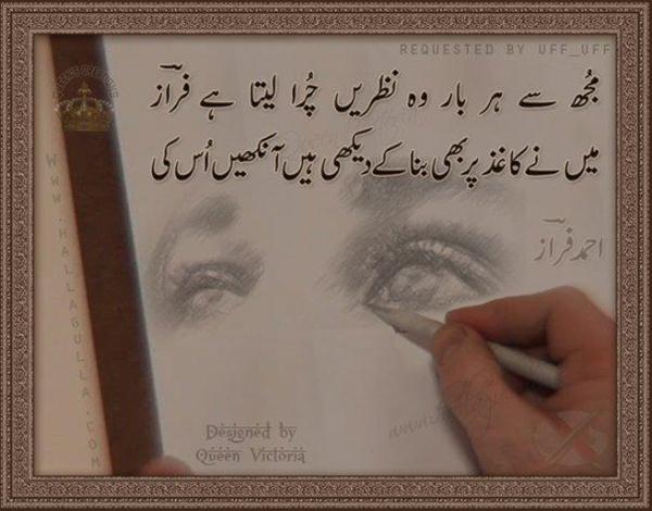 Main Umr K Rastey Mein Chup Chaap Bikhar Jaataa Ek Din Bhi Agar Apni Tanhaaii Se Dar JaataaMain Tark E Ta?alluq Par Zinda Huun So Mujrim Huun Kaash Uss K Leye Jiitaa, Apney Leye Mar Jaataa Uss Raat Koii Khushbu Qurbat Mein Naheen Jaagi Main Varnaa Sanvar Jaataa,Aur Voh Bhi Nikhar Jaataa Uss Jaan-E-Takallum Ko Tum Mujh Se Tou Milvatey Taskheer Na Kar Paataa, Hairaan Tou Kar Jaataa Kal Saamney Manzil Thii, Peechhey Meri Aavaazain Chaltaa Tou Bichhar Jaataa,Ruktaa Tou Safar Jaataa MaiN Shehr Ki Rounaq Mein, Gum Ho K Bohot Khush Thaa Ik Shaam Bachaa Laitaa, Ik Roz Tou Ghhar Jaataa Mehroom Fazaaoun Mein,Mayuus Nazaron Mein Tum AZM Naheen Tehrey, Main Kaise Tehar Jaataa