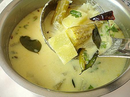Add the curd-coconut mixture to the vegetables and on low heat, cook stirring continuously, otherwise it might curdle. Adjust the salt and cook till the vegetables absorb the flavors and the gravy thickens. Do not boil. Turn off heat. Cover lid and let it sit for a few minutes before serving for the flavors to absorb.