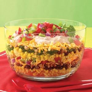 In the end whisk together sour cream and mayonnaise and pour it to the salad evenly, top with salsa and sprinkle some salt and pepper. Refrigerate the salad for 1-2 hrs. and then serve.