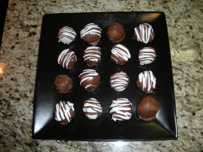 Once cake balls are frozen, dip in melted white chocolate and return to cookie sheet. Then drizzle the melted milk chocolate over the cake balls for a decorative touch.