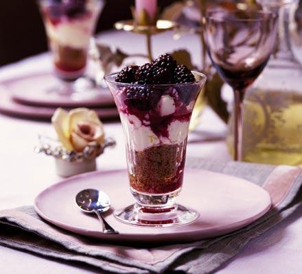 Meanwhile, mix together the crushed biscuits and melted butter. Spoon into 2 glasses. Gently fold the rest of the lemon juice, the lemon zest and icing sugar into the mascarpone or ricotta. Divide the lemony cheese between the glasses, then spoon over the blackberries and their syrupy juices.