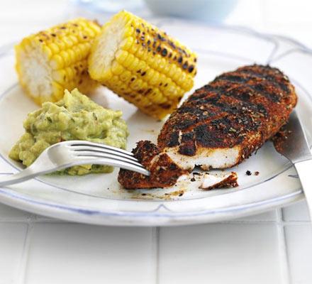 Brush the chicken on both sides with the oil, then coat all over with the spice mix. Heat a barbecue, griddle pan or grill, then cook the chicken for 5-6 mins on each side until cooked through. Serve each portion with a dollop of guacamole.