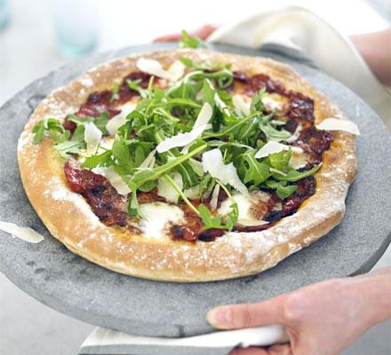 Heat the oven to 220C/fan 200C/gas 7. Make up the pizza base according to pack instructions. Roll out to a large circle (about 22cm) and put on a non-stick heavy baking sheet for 10 minutes to puff up a bit.