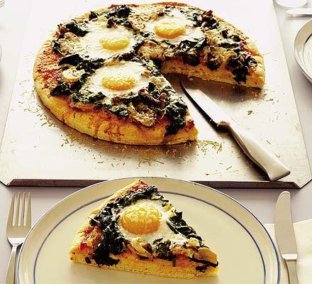 To cook the spinach, put it in a microwavable bowl, cover with cling film and pierce it a couple of times. Put in the microwave on High (850W) for 2 minutes until wilted (or cook in a covered pan for 2-3 minutes). Drain and spread the spinach over the pizza base, then get the mushrooms out of the jar with a fork and scatter them over the top. Season and sprinkle with half the parmesan. Bake for 10 minutes.