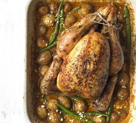 Tip in the beans, simmer for 4 more mins (or until tender), then splash in the fish sauce, any resting juices and squeeze over the remaining lime. Scatter with the peanuts for the authentic Massaman flavour. Carve the chicken and serve with the saucy potatoes and basmati rice.