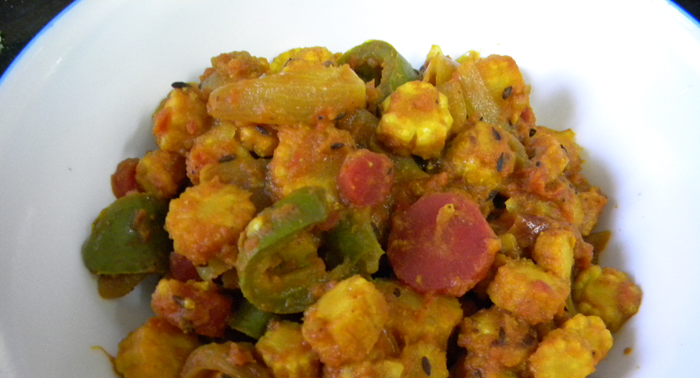 Heat oil in a pan and add cumin seeds. When they sizzle, add baby corns and all the other vegetables except pureed tomatoes.