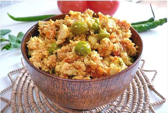 Wash the tofu and roughly mash it. Heat oil in a pan and add the tofu. Add one pinch of salt and one pinch of garam masala.