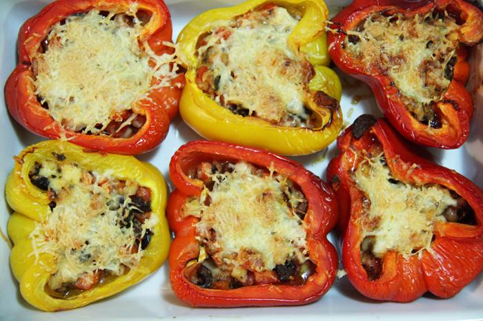 Fill in capsicums with potato mixture, mince mix, tomato ketchup, boiled peas, potato and mince meat again, sweet corns and mozzarella cheese.