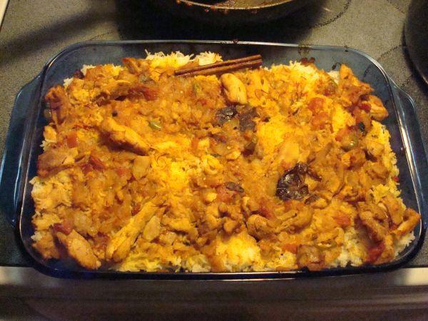 Layer rice and meat mixture and sprinkle with saffron mixture.