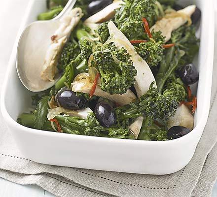Remove the shallots, chilli and garlic with a slotted spoon, then mix with the broccoli, olives and chicken.