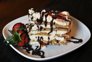 Refrigerate for at least four hours, or until the crackers have softened completely.To serve, cut into squares and garnish with fresh sliced strawberries and chocolate sauce.