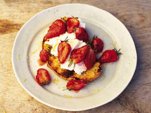 Top the warm bread with ricotta and the grilled strawberries. Drizzle with honey and decorate with lemon zest