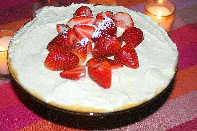 Finally decorate the pudding with some fresh strawberries. Sprinkle the strawberries with some icing sugar for a professional finish.