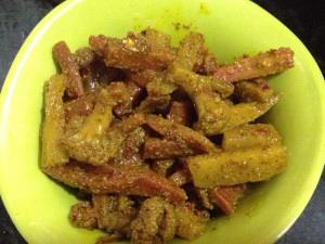 In a large bowl mix all spices along with dry vegetables.Mix thoroughly so that all spices stick to the vegetables.