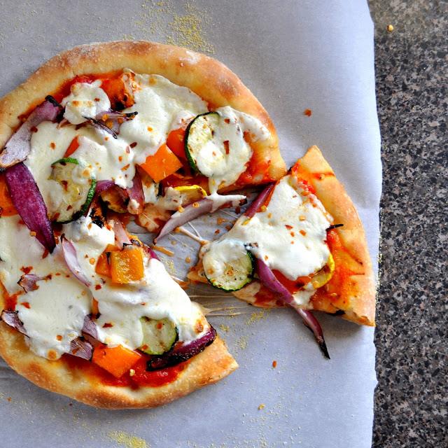 Bake pizza dough for 4 minutes. Remove partially baked crust from oven. Spread a thin layer of tomato sauce on the crust followed zucchini, squash, peppers and onions.