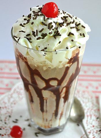 Then add this frozen mixture in a blender along with ice, milk, condensed milk and cream, blend and serve in glasses with chocolate sauce and whipped cream.