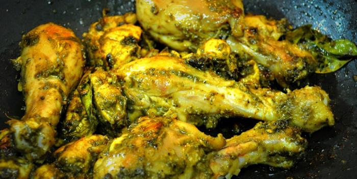 Gently place the chicken drumsticks into the baandley, and coat all of it with the coriander & mint paste.