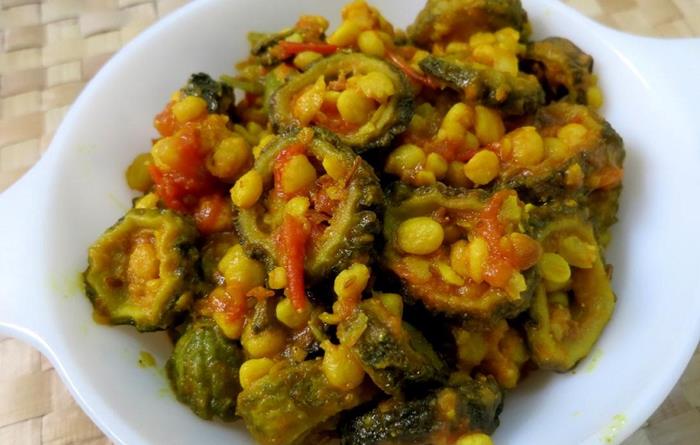 Now add boiled gram lentil with sliced bitter gourd.