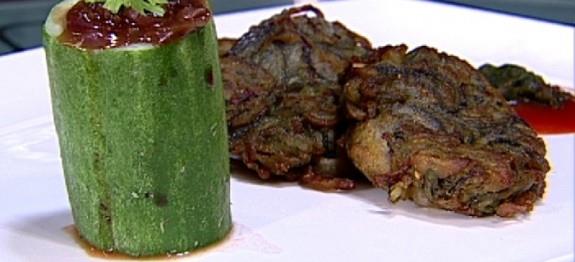 Spread thin slices of onions on a plate. Lightly rub with lemon grass, red chilli, green chilli and ginger, and keep aside for 5-10 minutes.