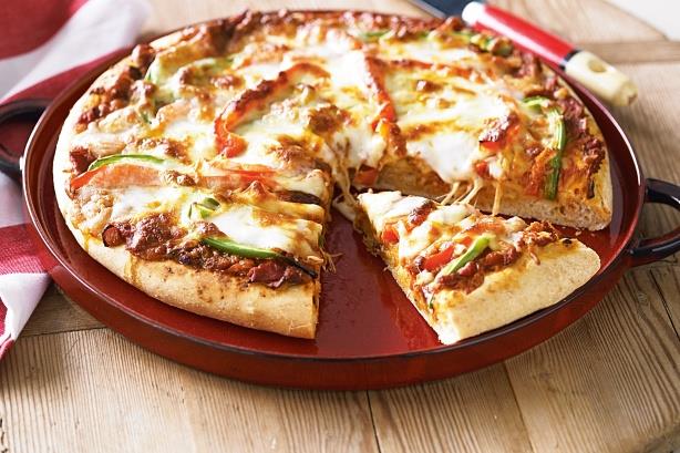 Line a pizza plate, prick with fork, spread with 2 tbsp pizza sauce, sprinkle 3 tbsp cheddar cheese and filling, top with cheddar and mozzarella cheese.