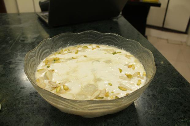 Drizzle fresh cream and sprinkle pistachios, almonds and pomegranate kernels on top and serve at once.