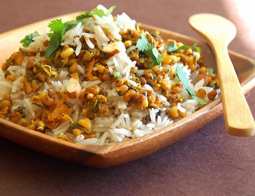 For serving spoon rice onto a large platter. Make a well in the centre and place beans. Garnish with fried nuts and serve with a raita.