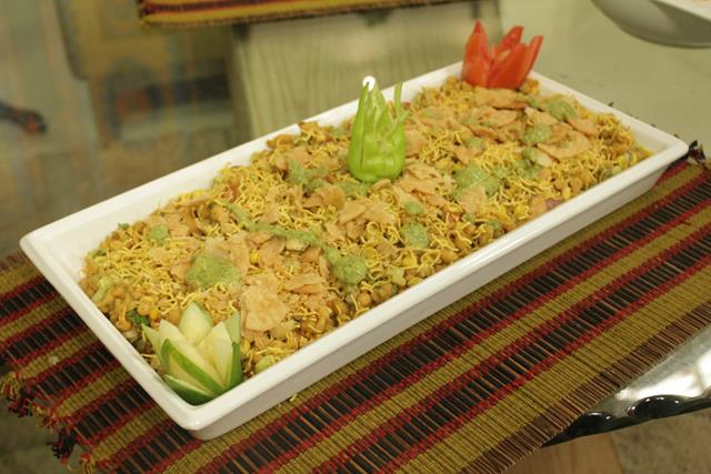 Serve with crushed papri and coriander leaves on top.