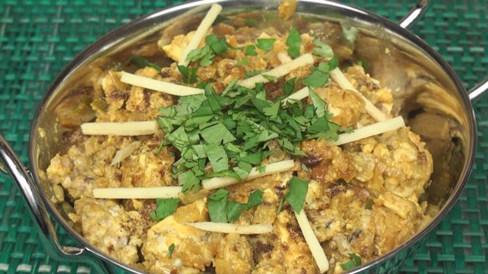 Heat oil in a pan and add red chili powder, turmeric powder whole spices, ginger garlic paste, yogurt and veal brain pieces.