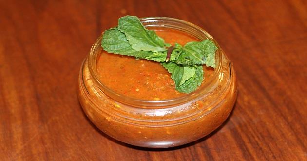 In a blender, blended boiled tomatoes, garlic cloves, lemon juice, mint leaves, noshader, black salt, salt and Kashmiri red chilies.