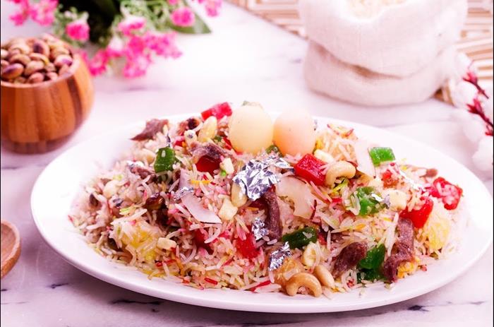 Now, in a pan, add desi ghee, milk, green cardamom, sugar, almond, cashew, pistachio, Copra, raisin, boiled rice and cook for 3-4 minutes.