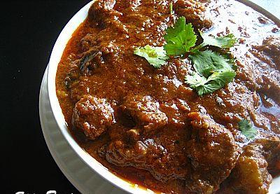 Then pressure cooks the mutton pieces with chilli powder, salt and turmeric powder up to 7 whistles.
